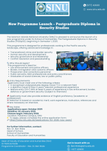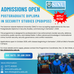 The Solomon Islands National University (SINU) is now accepting applications for the Postgraduate Diploma in Security Studies (PGDipSS), commencing Semester 1, 2026. This specialised programme ...