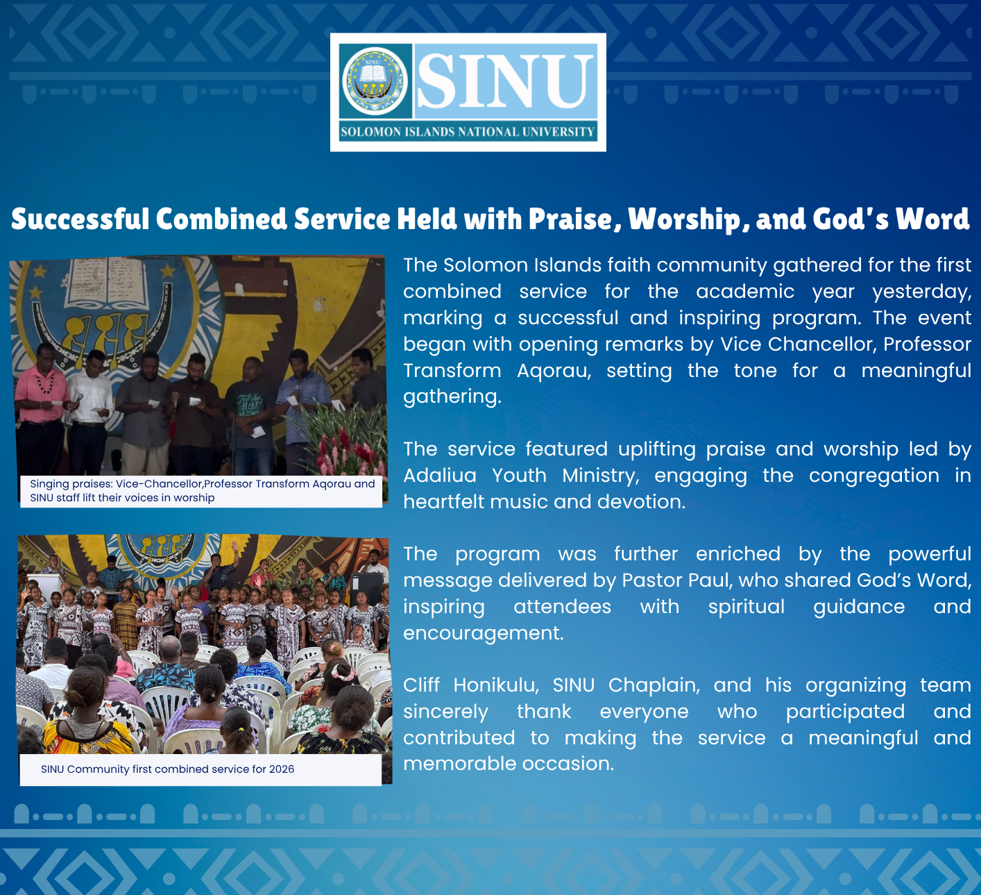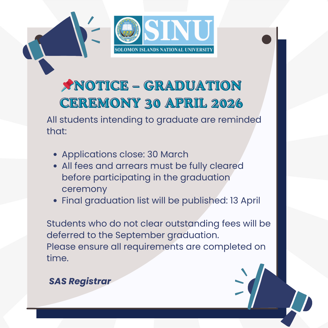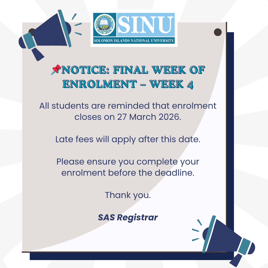 Press Release 23 March 2026 The Solomon Islands National University (SINU) Centre for Distance and Flexible Learning (CDFL) marked a significant milestone on Thursday, 19 March, by awarding Certificates of Attainment to 100 students who successfully completed their pathway studies. Read More …