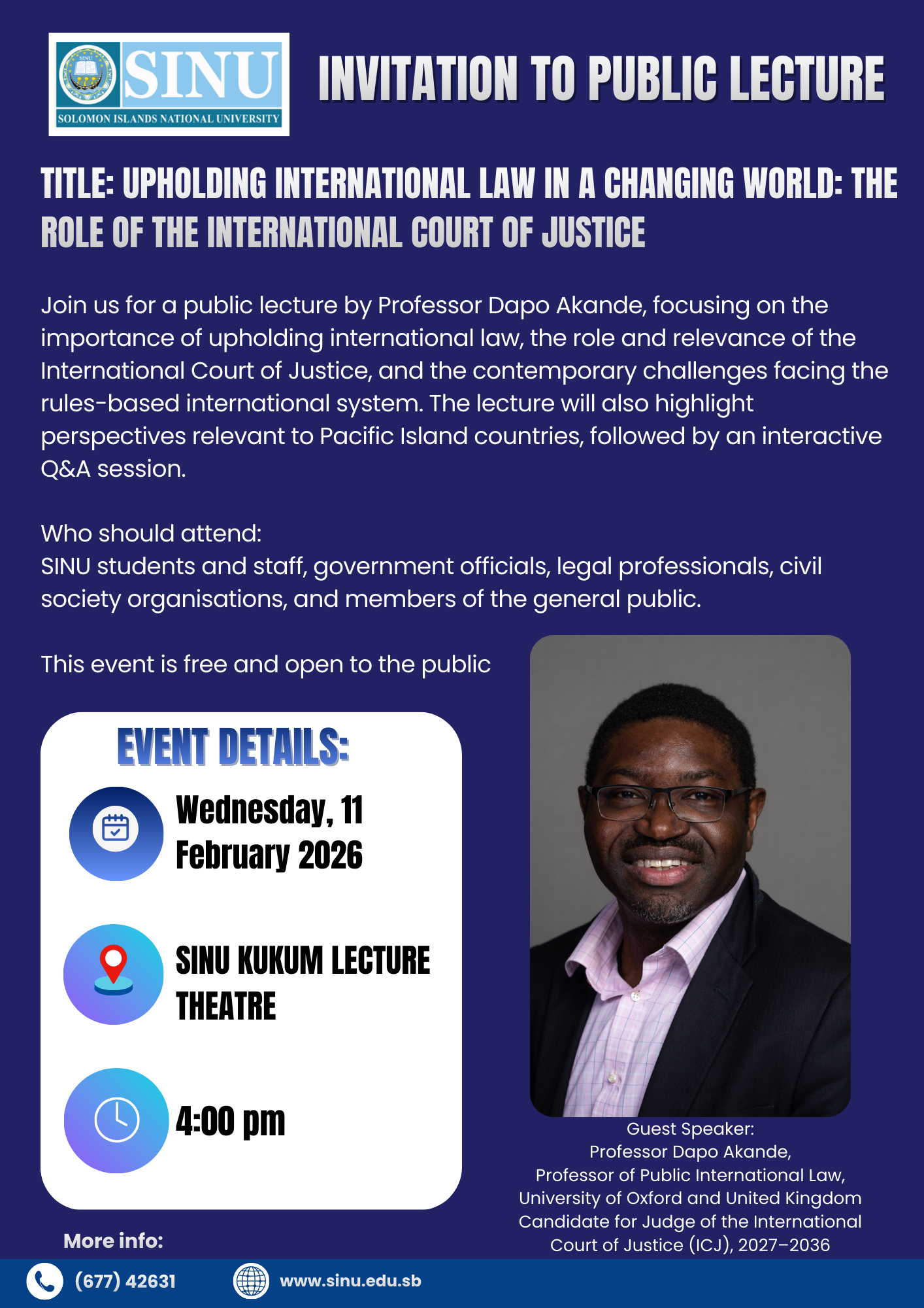 Solomon Islands National University (SINU) warmly invites students, staff, stakeholders, and members of the public to a Public Lecture by Professor Dapo Akande. ๐ Topic:Upholding International Law in a Changing World:The Role of the International Court of Justice ๐ Wednesday, Read More …