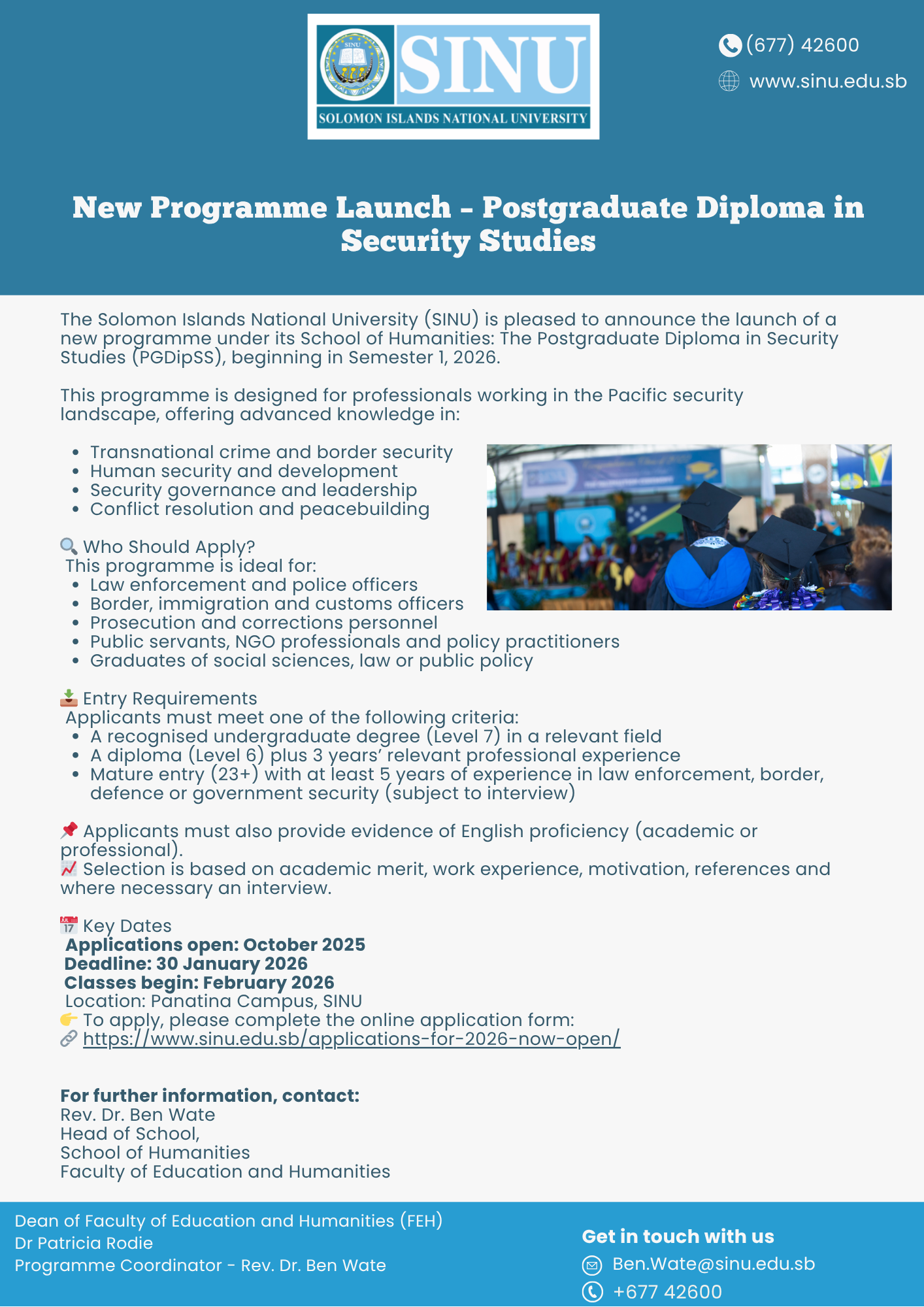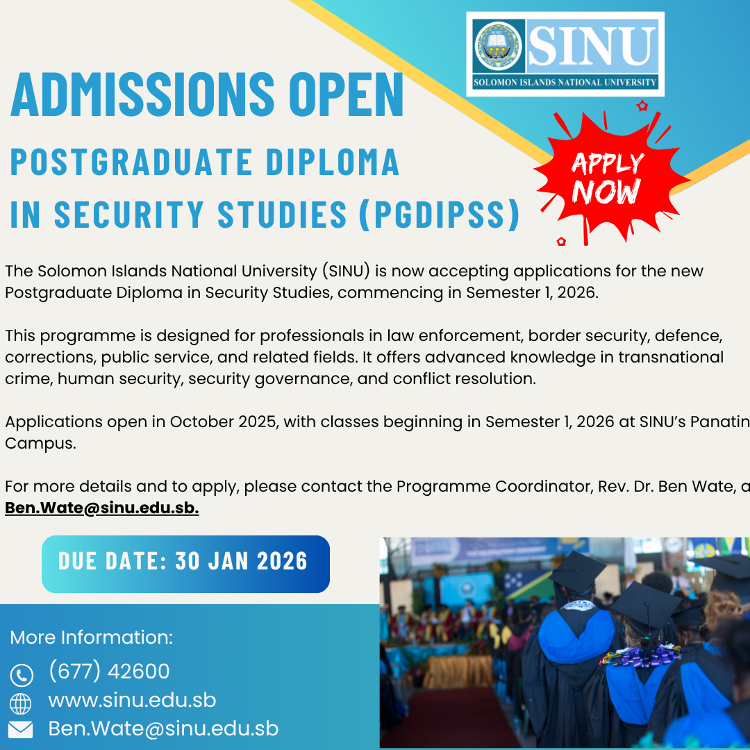 Solomon Islands National University (SINU) is launching a Postgraduate Diploma in Security Studies (PGDipSS), starting Semester 1, 2026. This programme is designed for professionals working in law enforcement, border security, governance, peacebuilding, and related fields. Applications open: October 2025 Deadline: Read More …
