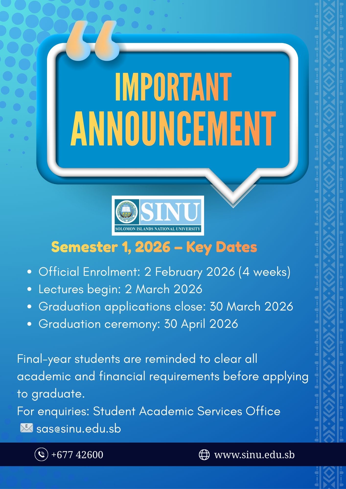 The Solomon Islands National University (SINU) wishes to inform all students and members of the public of the following key dates for the Semester 1, 2026 Academic Year: Enrolment & Academic Dates Official enrolment opens: 2 February 2026 Enrolment period: Read More …
